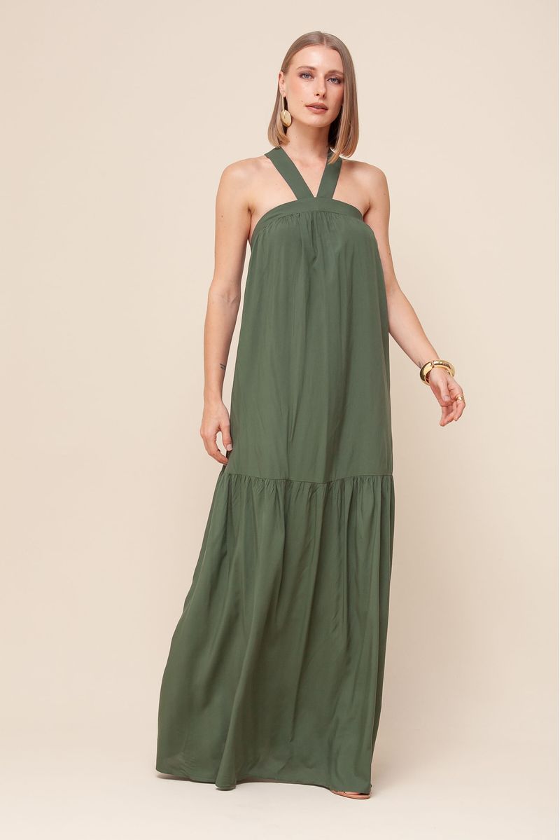 Vestido longo em viscose, comprimento com pregas que traz leveza e movimento à peça. As alças largas se cruzam nas costas, criando um decote elegante, enquanto o zíper invisível proporciona um ajuste perfeito.