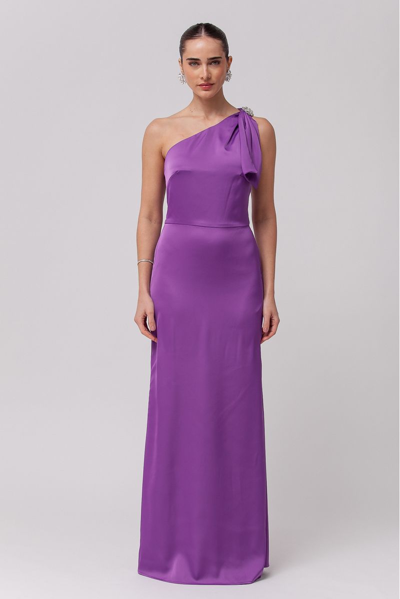 Vestido longo em cetim, com uma manga única do lado esquerdo, adornada com um broche de pedraria e um detalhe no ombro que confere sofisticação ao modelo. O silicone no busto garante maior sustentação, proporcionando um ajuste confortável e seguro. O corte acinturado com saia evasê oferece um caimento fluido e elegante, enquanto o fechamento por zíper invisível na lateral esquerda e o na parte superior asseguram um encaixe perfeito. Forro interno para mais conforto. Acompanha capa protetora e cabide personalizado Mamô, garantindo o melhor cuidado para a peça.