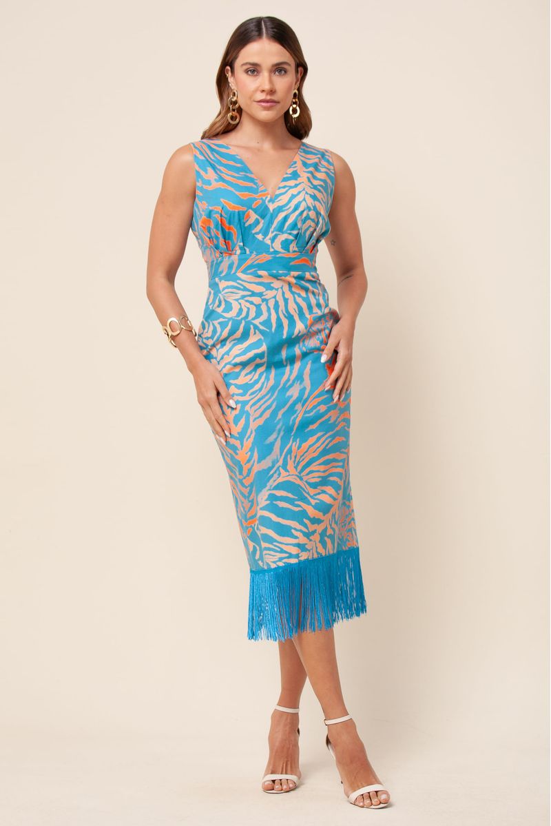 O Vestido Midi Franjas é confeccionado em algodão, possui estampa exclusiva Milano inspirada nas cores e desenhos que remetem à natureza. Além disso, conta com forro interno, decote em V, alças largas e reguláveis, zíper posterior e destaque na barra com acabamento em franjas.