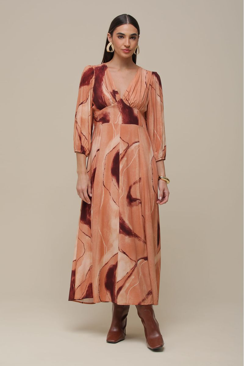 Vestido midi em viscose com estampa exclusiva, leve e fluido. Conta com forro interno, decote em V, mangas 3/4 estilo princesa com elástico, além de modelagem evasê que valoriza a silhueta. Fechamento invisível nas costas.