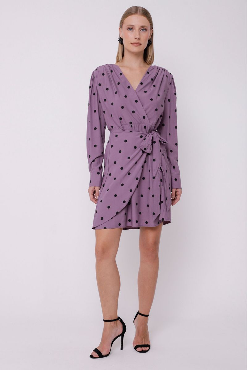 Vestido curto confeccionado em viscose acetinada, apresentando um elegante decote em V transpassado com botão invisível. Com detalhes de pregas nos ombros, mangas longas com botões nos punhos e uma parte frontal que permite amarração com tecido, proporcionando um visual refinado e moderno.