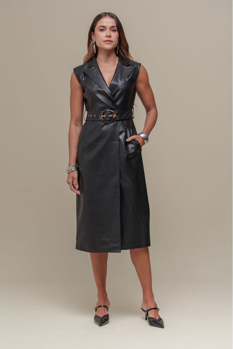 Vestido midi em PU com acabamento liso e estrutura encorpada. Modelagem reta transpassada com fechamento frontal. Possui gola com lapela, recorte sem mangas, cinto com fivela redonda e bolsos laterais funcionais.