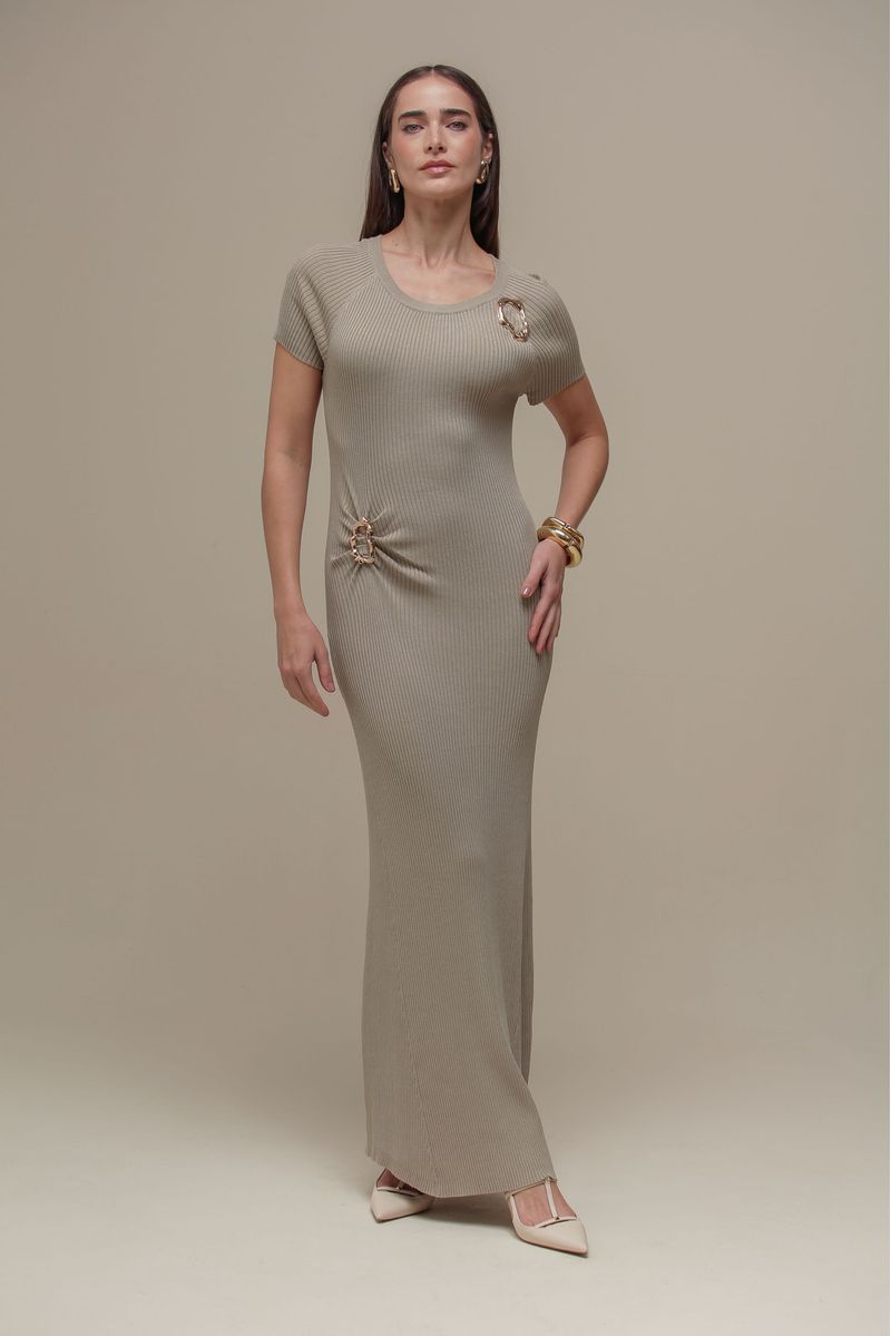 Vestido longo em tricô texturizado, com parte superior ajustada, gola U e manga curta. A peça conta com aplicação de fivelas orgânica fixas no ombro esquerdo e parte inferior em modelagem evasê com recortes, trazendo movimento e elegância.