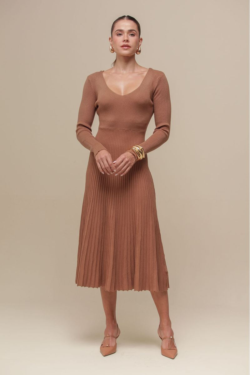 Vestido midi em tricô com parte superior ajustada e lisa. Decote V frontal e nas costas, com tira de sustentação na nuca para maior conforto. Mangas longas e saia plissada com caimento estruturado, valorizando a silhueta.