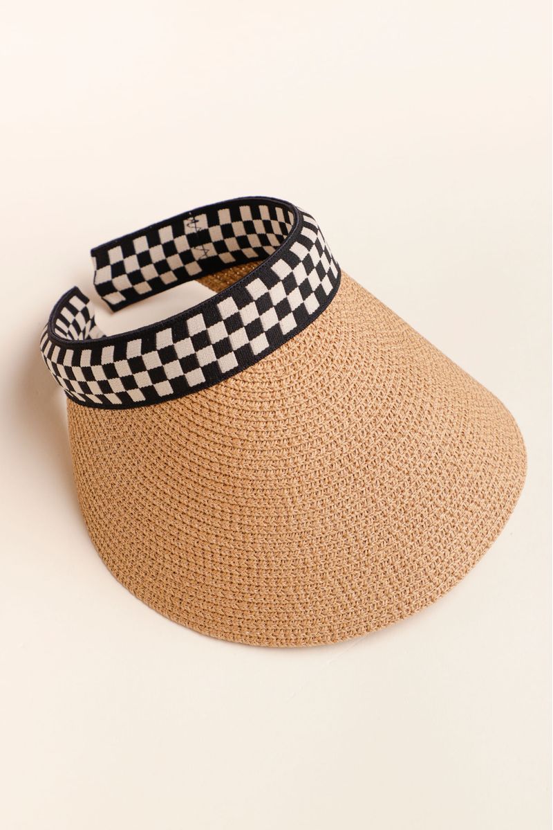 Viseira de palha com detalhes em gorgurão, oferecendo uma combinação charmosa de estilo e praticidade para proteção solar.